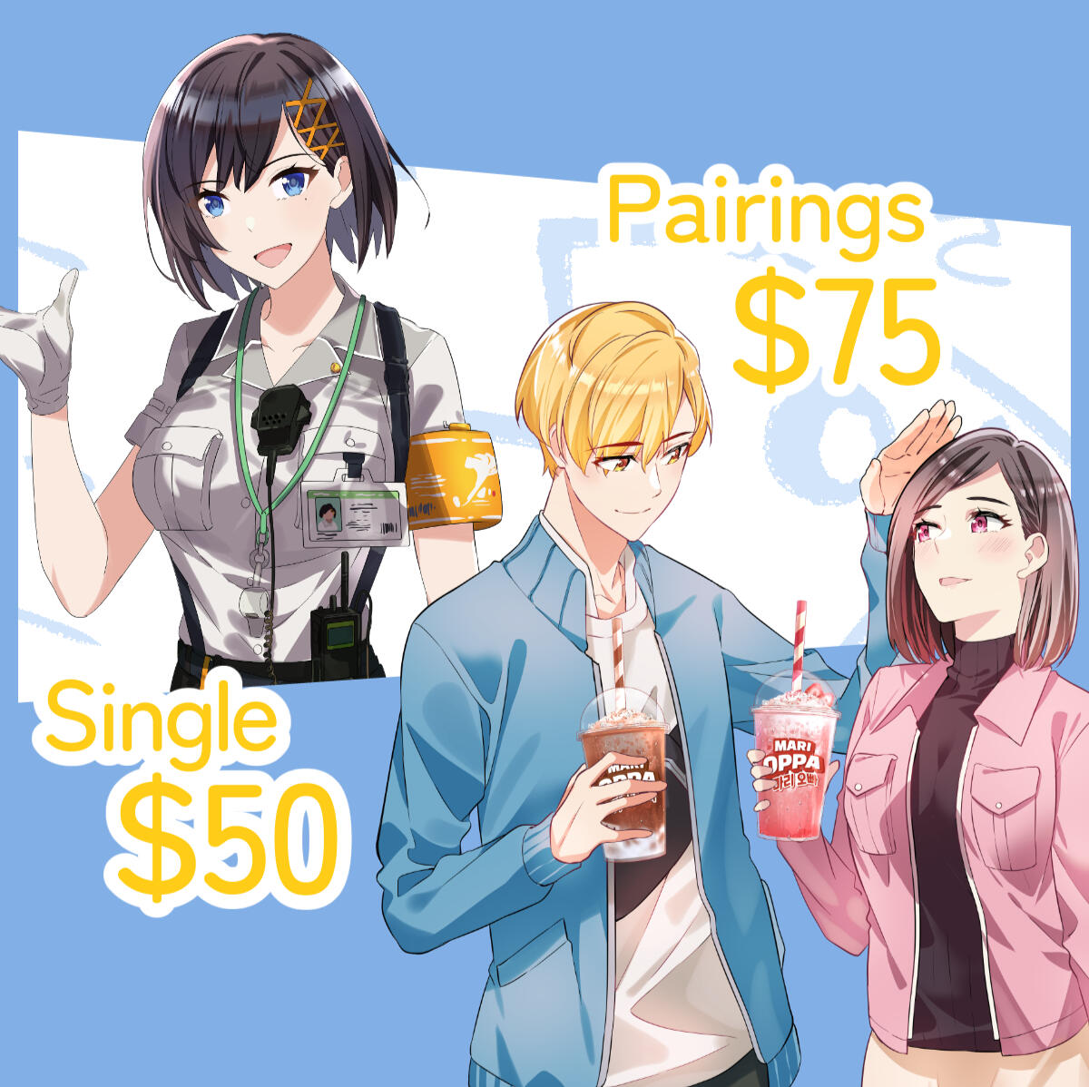 We'll draw a character of your choosing with from waist up with finished CG coloring. We also offer the service of paired characters illustration for a different rate!50 USD/500K IDR base rate